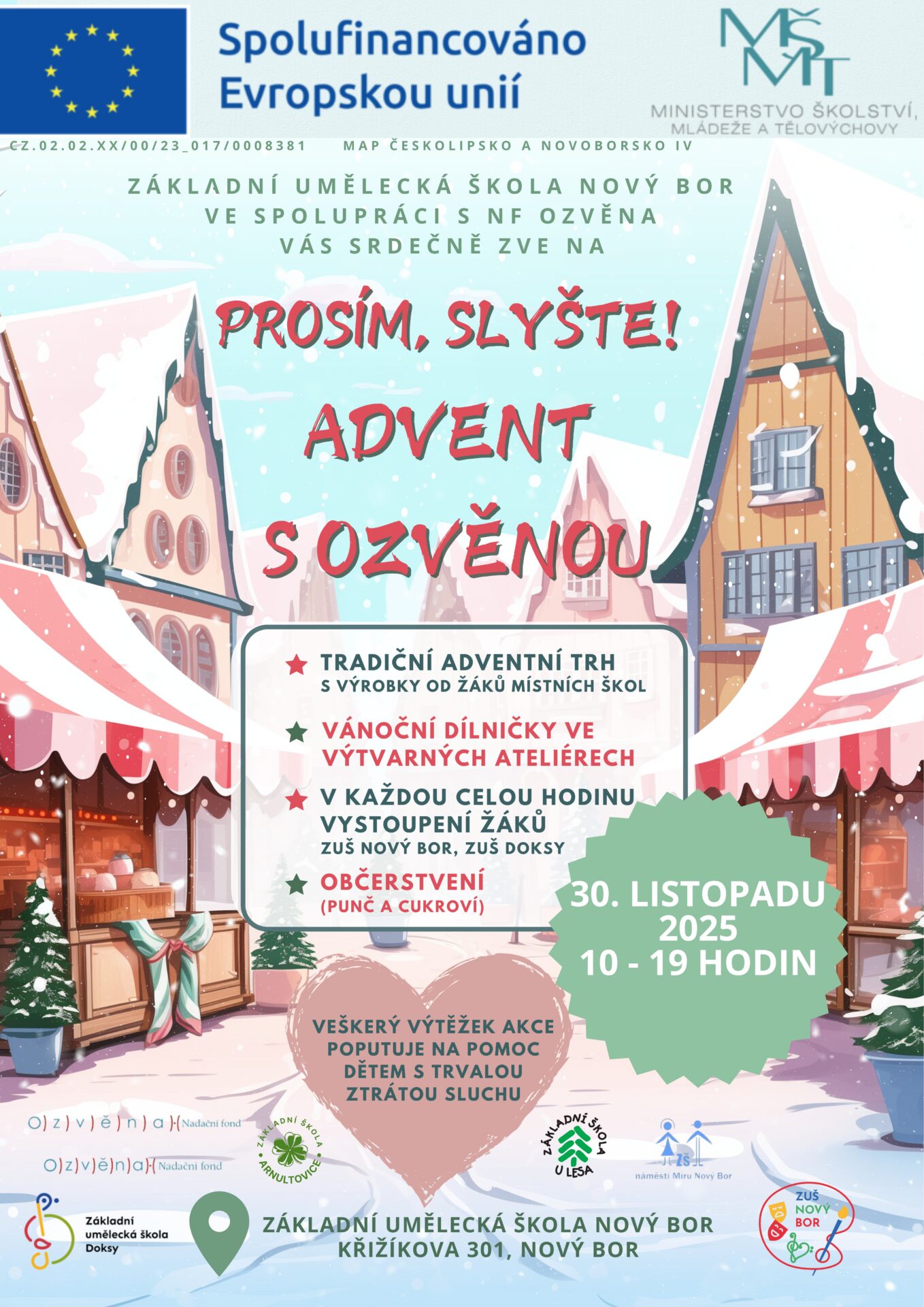 Advent s Ozvěnou – charitativní akce pro celou rodinu a na celý den, kterou pořádá ve své budově ZUŠ Nový Bor ve spolupráci s nadačním fondem Ozvěna. Naši žáci zde zahrají ve třech hudebních vstupech v 11, 12 a 13 hodin a výtvarníci připravili krásné výrobky na vánoční trh. Více o akci samotné najdete zde: ADVENT S OZVĚNOU