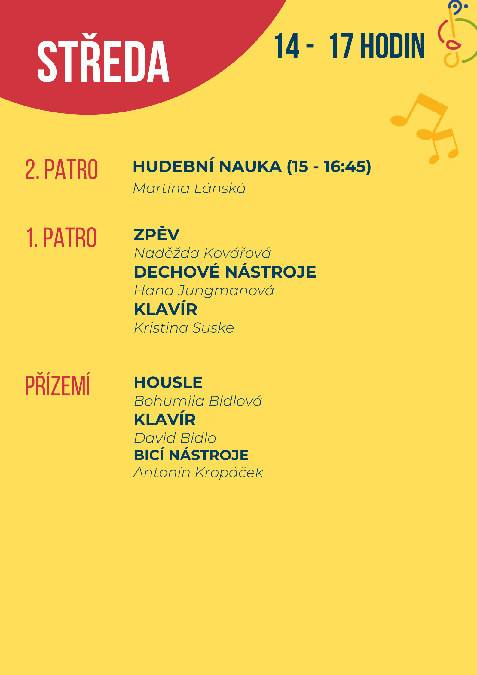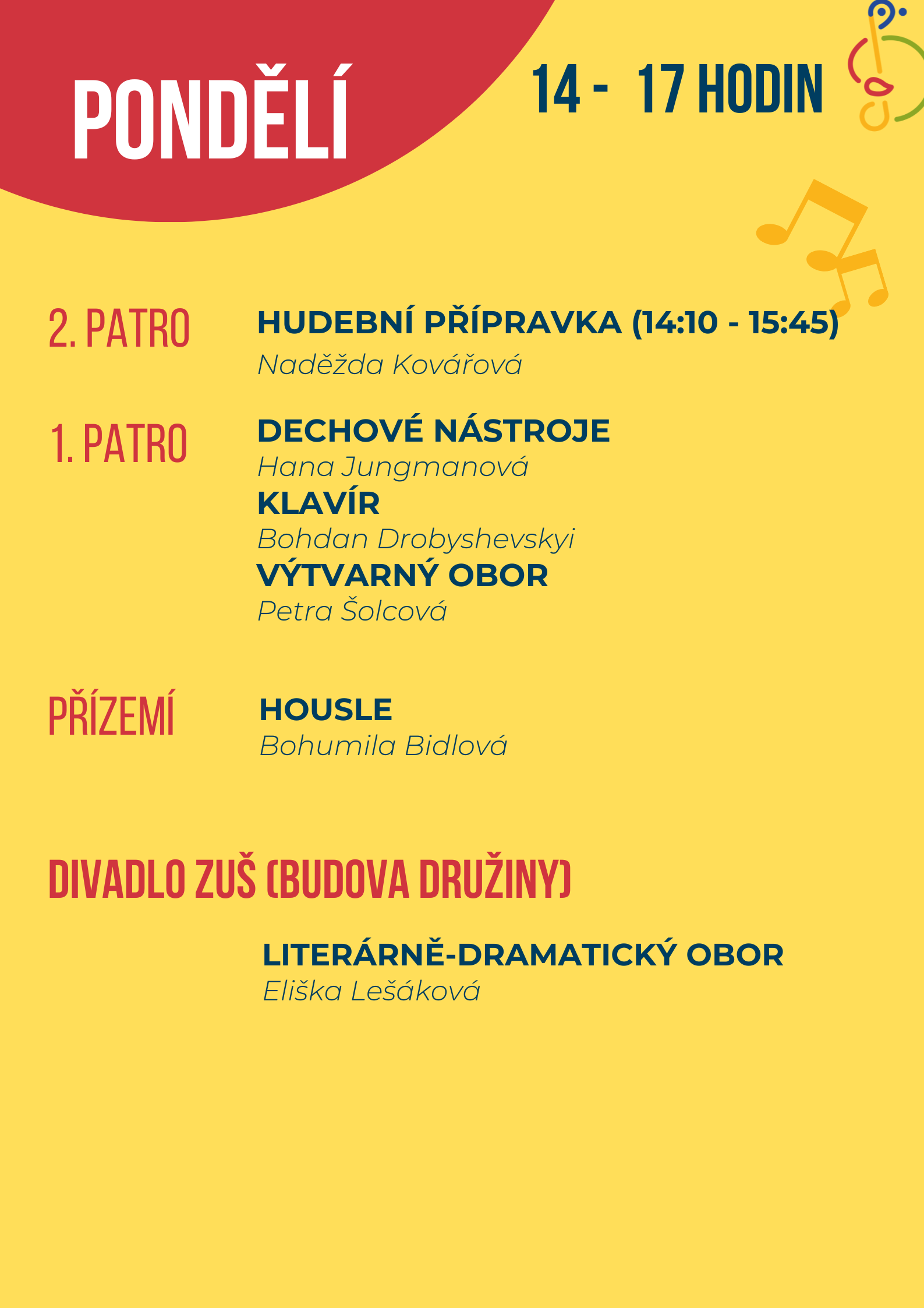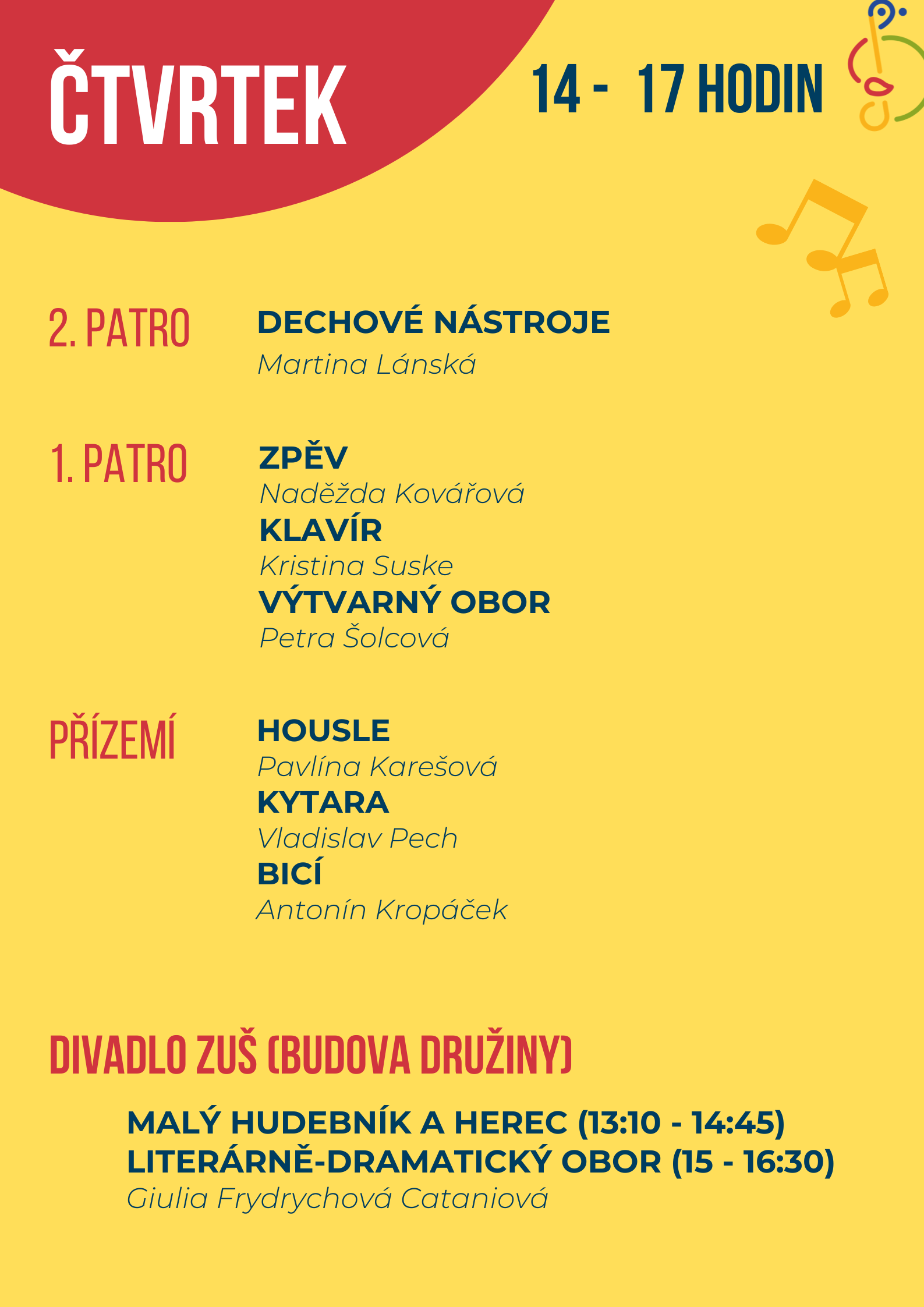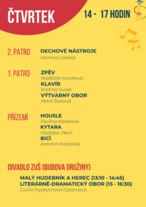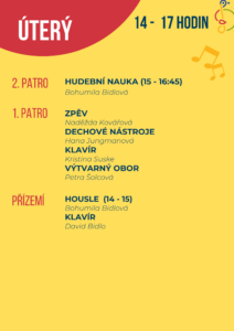 Využijte příležitost k nahlédnutí do výuky, popovídání a seznámení s pedagogy, vyzkoušení činností v uměleckých oborech a načerpání tvůrčí atmosféry.